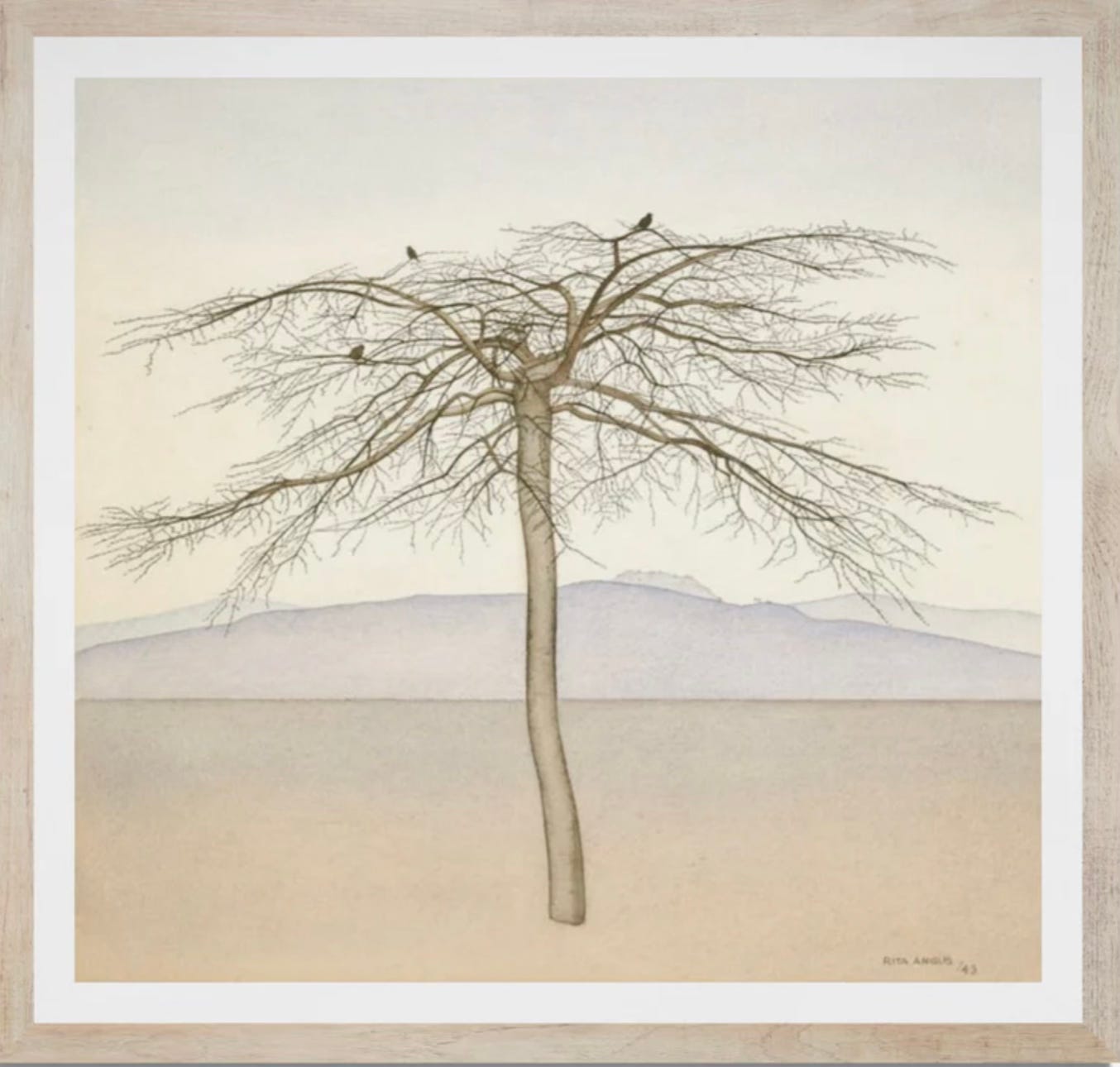 O Rita, your tree speaks volumes to me about art as an antenna for sadness. An aerial. Hence I think of Sylvia Plath. Her echo. I know you painted it alone; I know you spent a lot of time alone – the tree is singular, alone, in winter, its cloak of leaves surpassed; it looks lonely, despite the three birds that annotate the topmost branches, huddled in. But am I just telling you something about me? What kind of tree? In ‘The Moon and the Yew Tree’ Sylvia Plath concludes ‘the message of the yew tree is blackness – blackness and silence’.